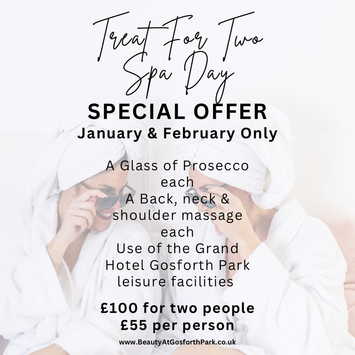 Treat For Two spa day at Beauty At Gosforth Park for two includes a back, neck and shoulder massage and a glass of Prosecco each with use of the Grand hotel Gosforth, Newcastle leisure facilities £110 for two people